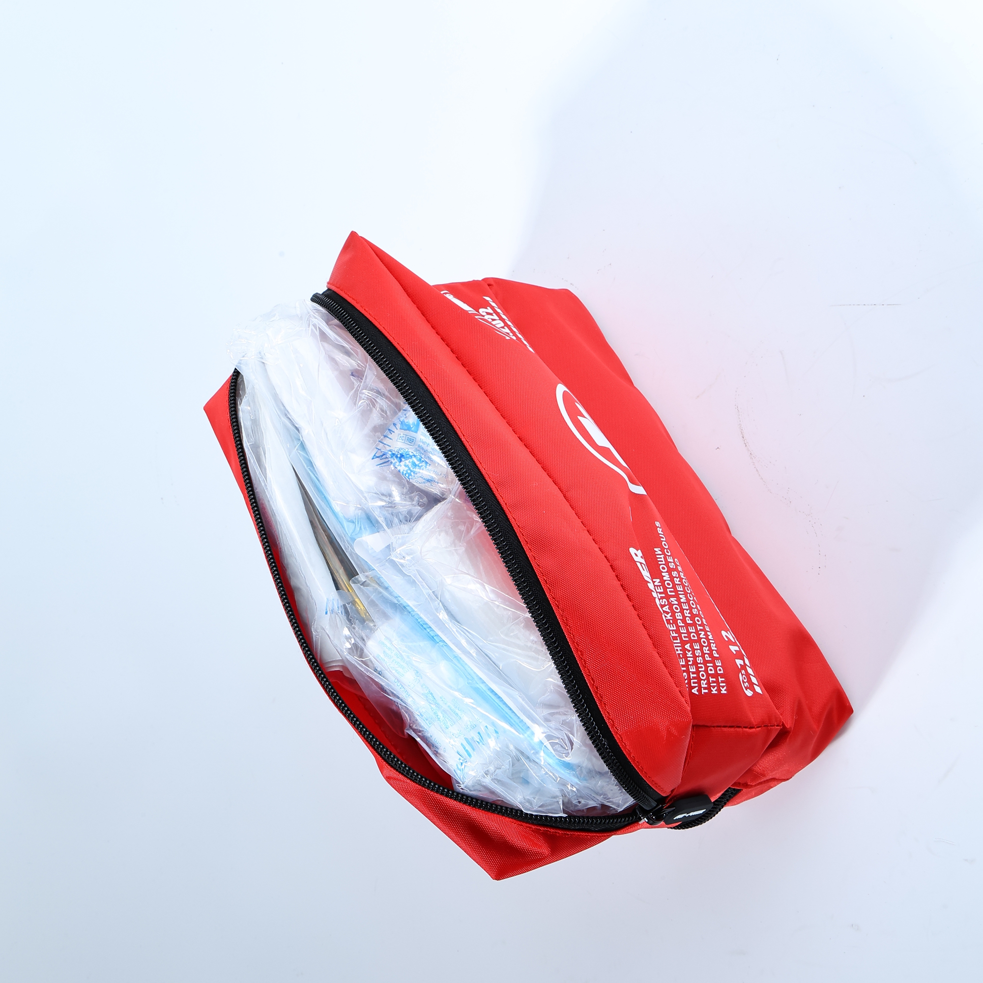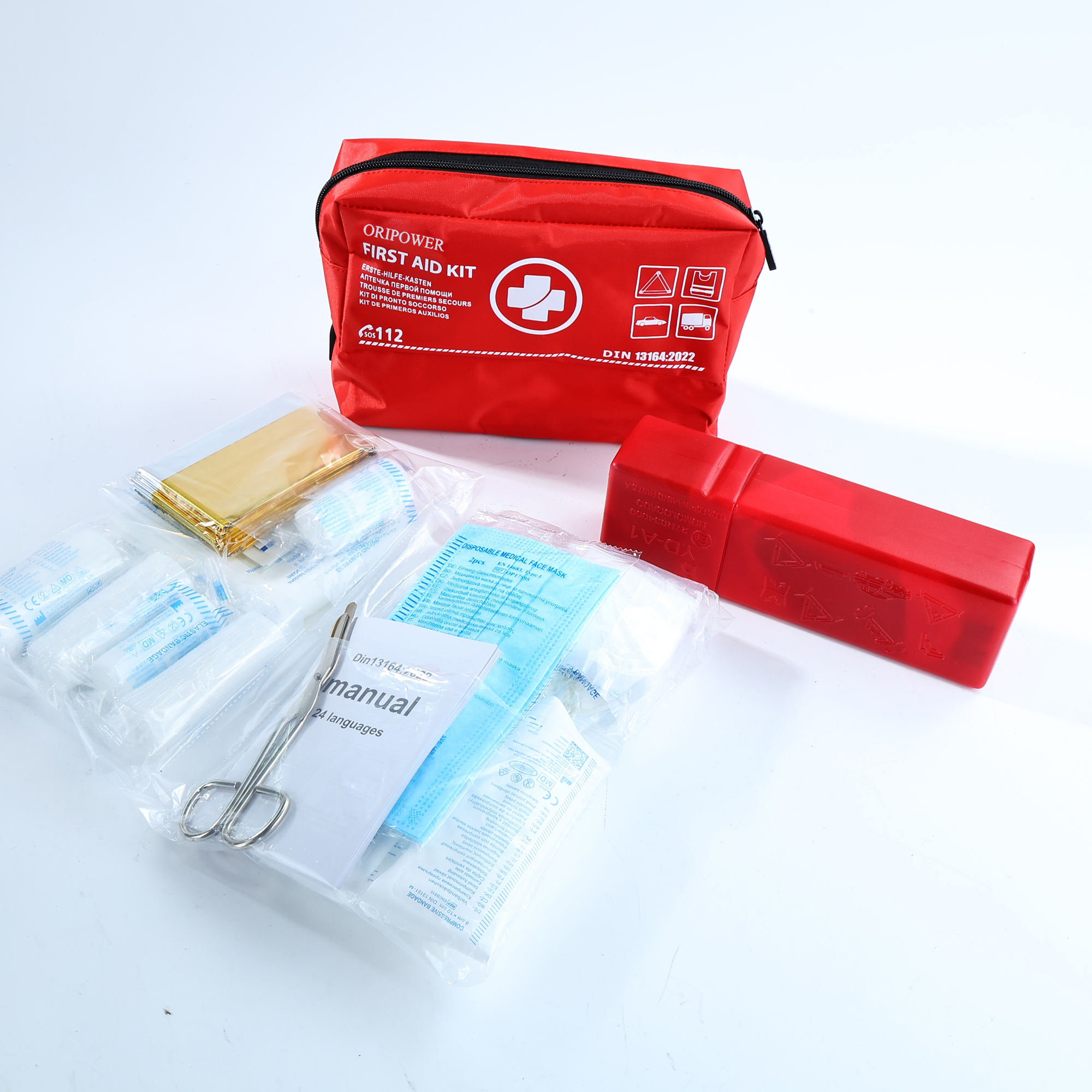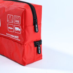 - Strumenti ed extra: forbici mediche da 15 cm, nastro da 2,5 cm x 5 m, un triangolo di emergenza (43 cm, certificato EMARK) e un manuale di primo soccorso completo.