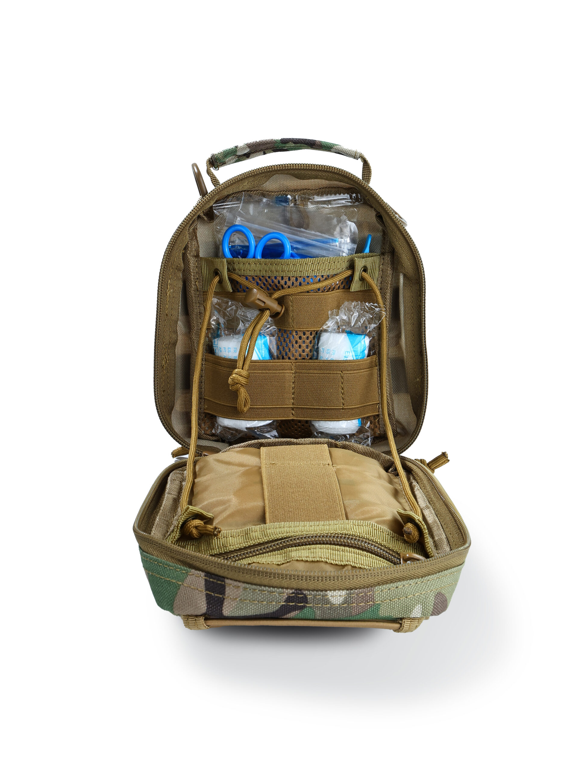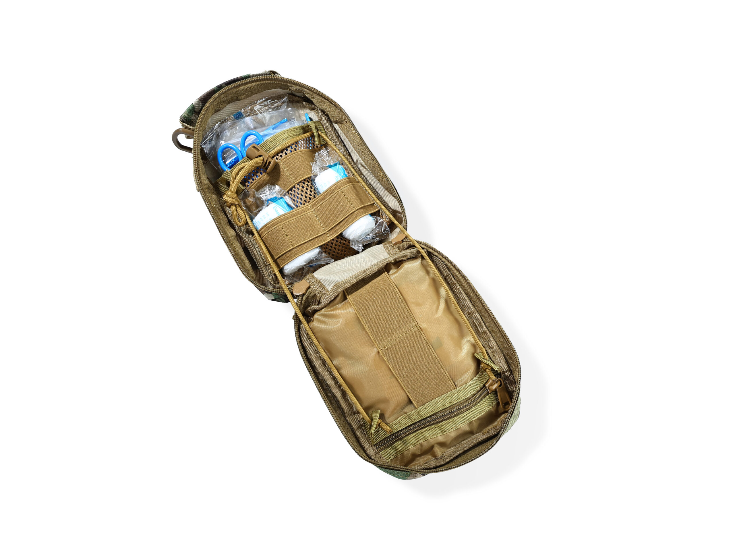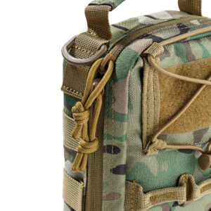 Questo kit di prima qualità è ricco di materiale medico essenziale, organizzato in modo ordinato in una robusta borsa militare di 20,5x20x11,3 cm:
